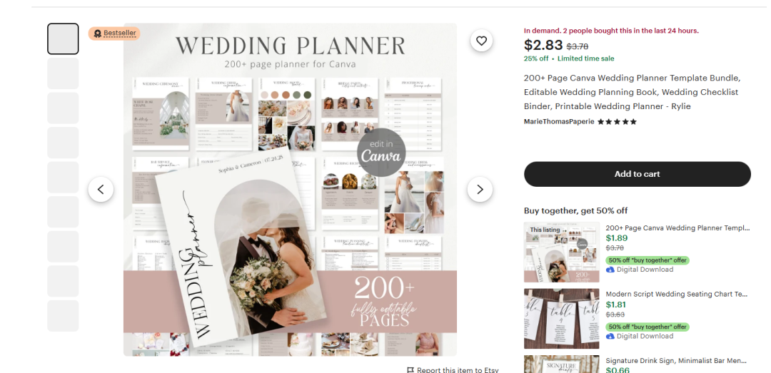 Canva es una herramienta gratuita de codigo abierto que puedes usar para disenar carteles, banner, invitaciones de boda, etc. Hay un libro de planificacion de boda hecho con plantillas de Canva, de 200 paginas, que cubre planificacion de boda, esquemas de color, seleccion de ropa, listas de verificacion, todo relacionado con la boda, vendido a $3 dolares. Aunque el precio unitario es bajo, las ventas son 139,000 unidades, multiplicando por $3 dolares son aproximadamente $400,000 dolares.