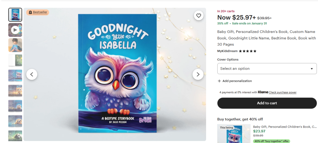 Este es el producto mas facil de crear y tambien muy divertido. Hay muchos libros electronicos de este tipo, son literalmente libros de cuentos infantiles. Puedes ver vistas previas en video y ver diferentes tipos de libros electronicos, como paginas para colorear, historias de ficcion, canciones infantiles, hojas de trabajo de nutricia, y recursos educativos de matematicas y ciencias. Puedes dejar volar tu creatividad. Todas las imagenes son generadas por IA, las historias aussi las puede escribir ChatGPT, usar Gemini para generar imagenes gratuitamente. Un libro llamado Buenas noches, little Isabel, con descuento de 70% vende a $27 dolares, es un libro de cuentos, con 5 estrellas, mas de 18,000 ventas. Solo vendiendo este simple libro electronico infantil gano $486,000 dolares.