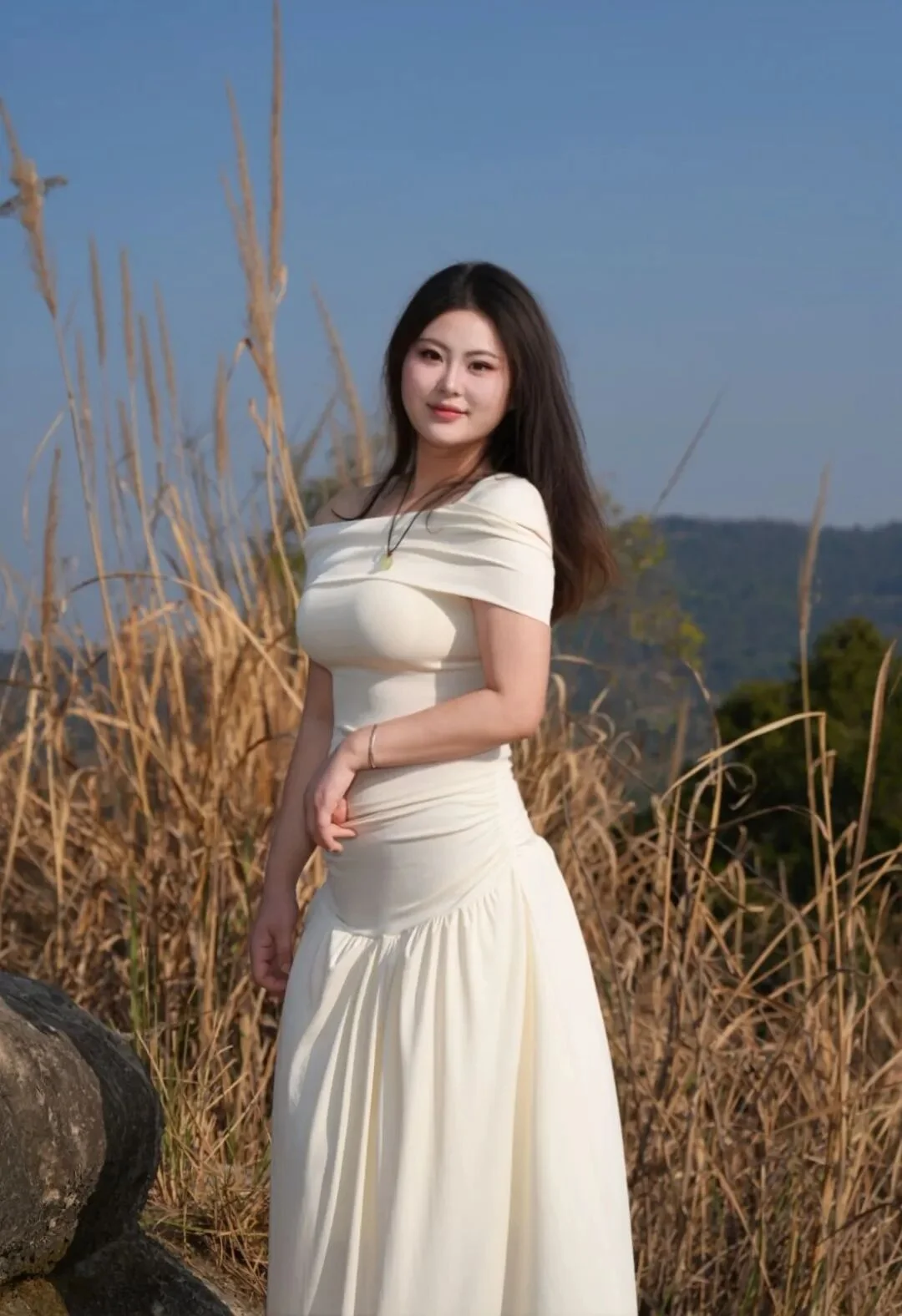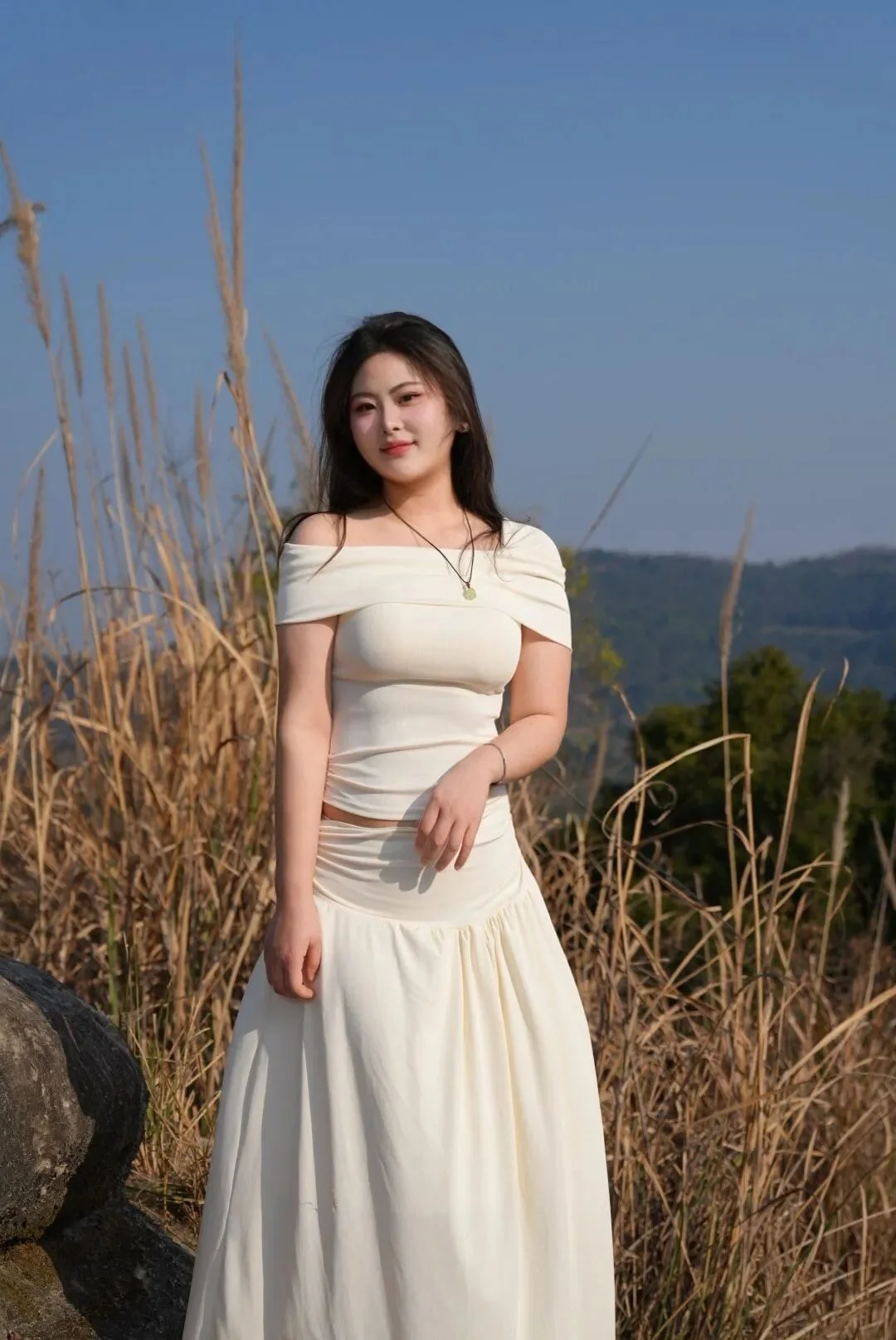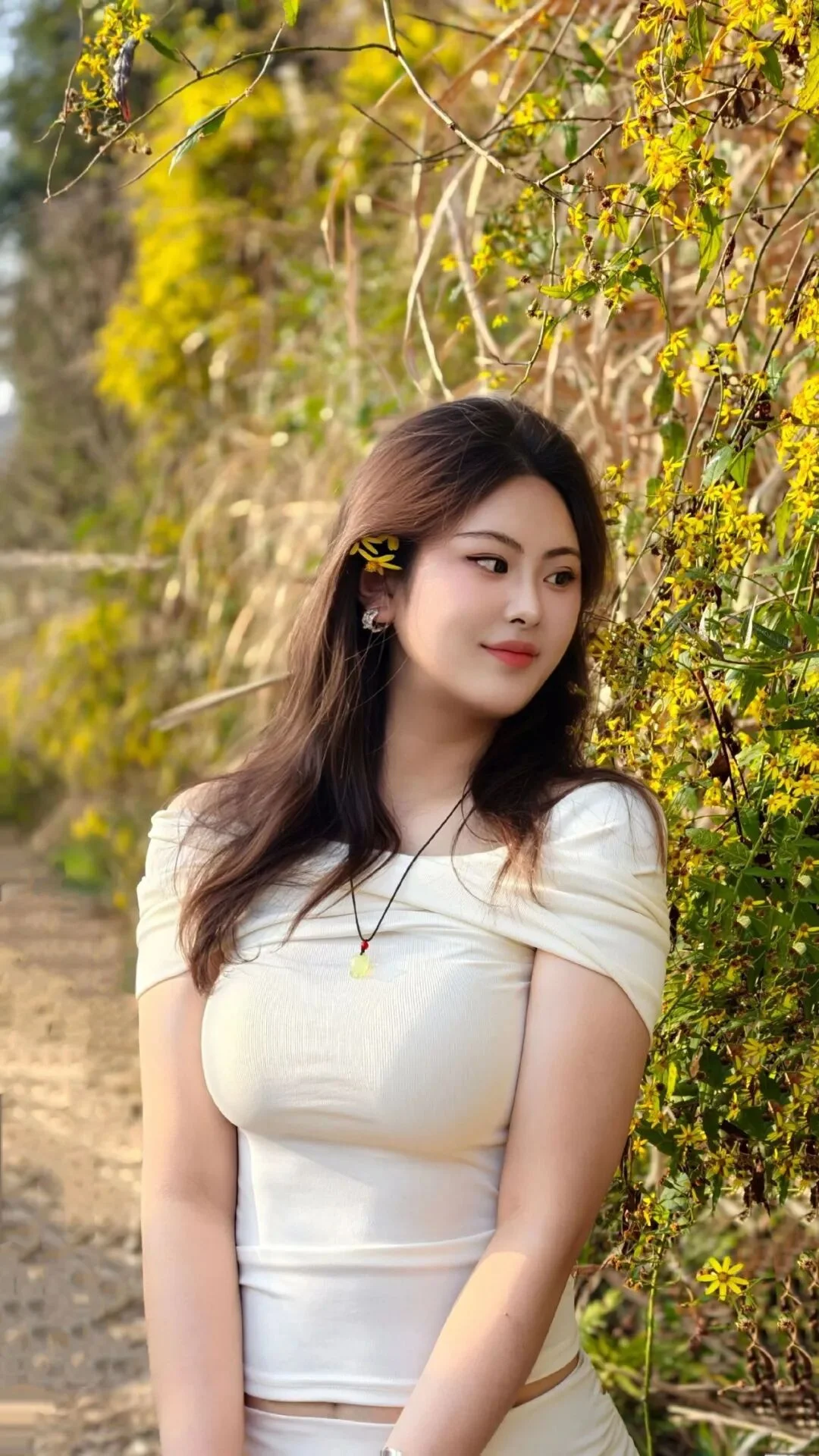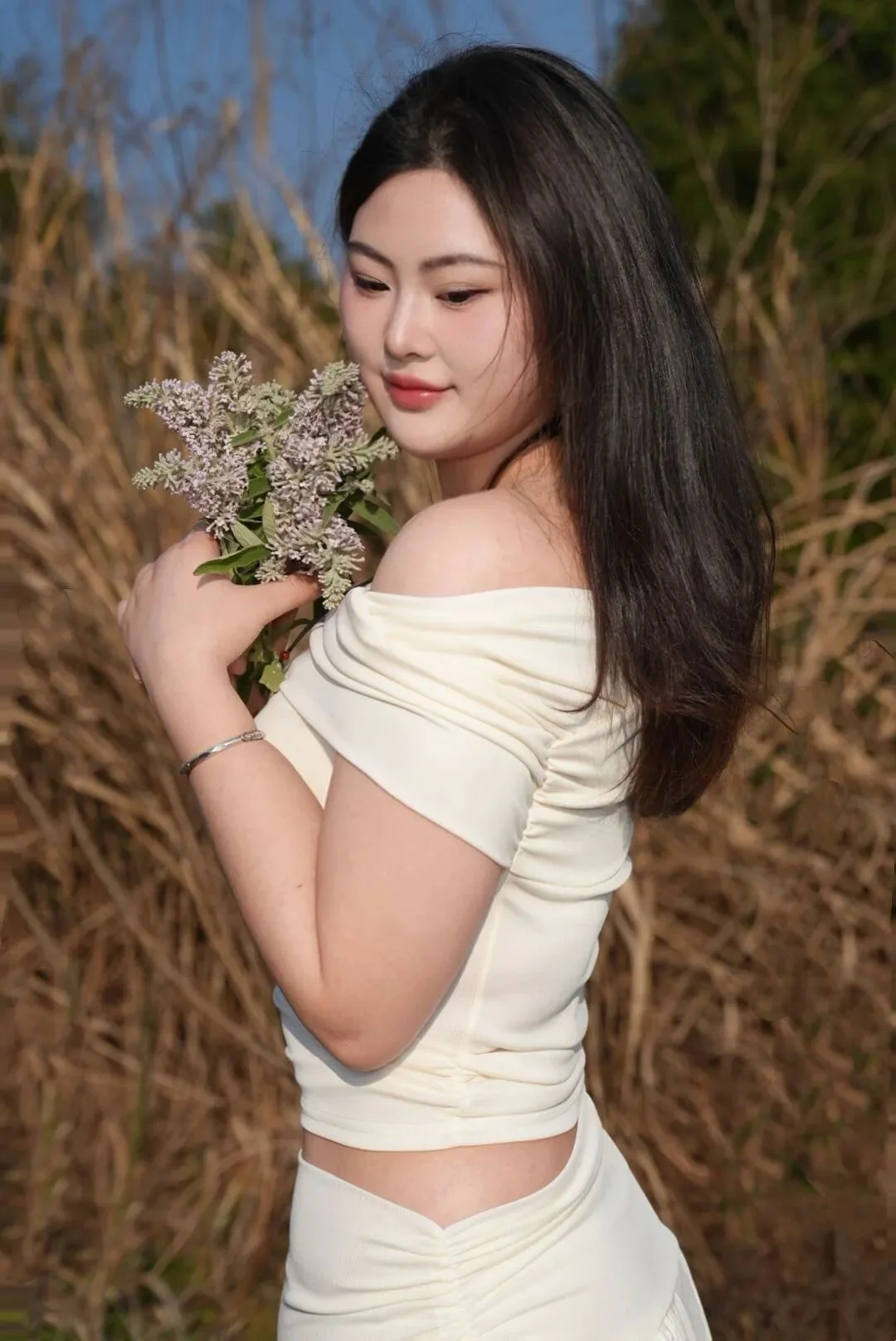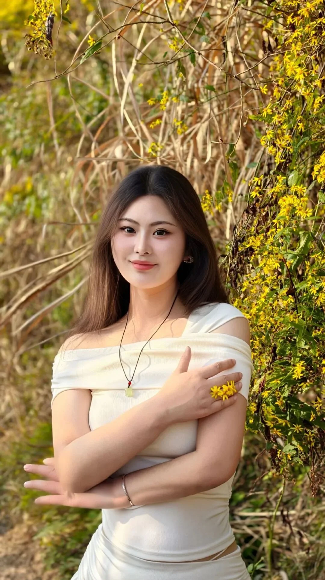 Al pararte de frente, coloca suavemente las manos en el pecho, sosteniendo una pequena flor con los dedos. Mira hacia arriba hacia la camara, con una dulce sonrisa. Esta pose es simple pero conestilo, muy versatil al fotografiar en exterior.