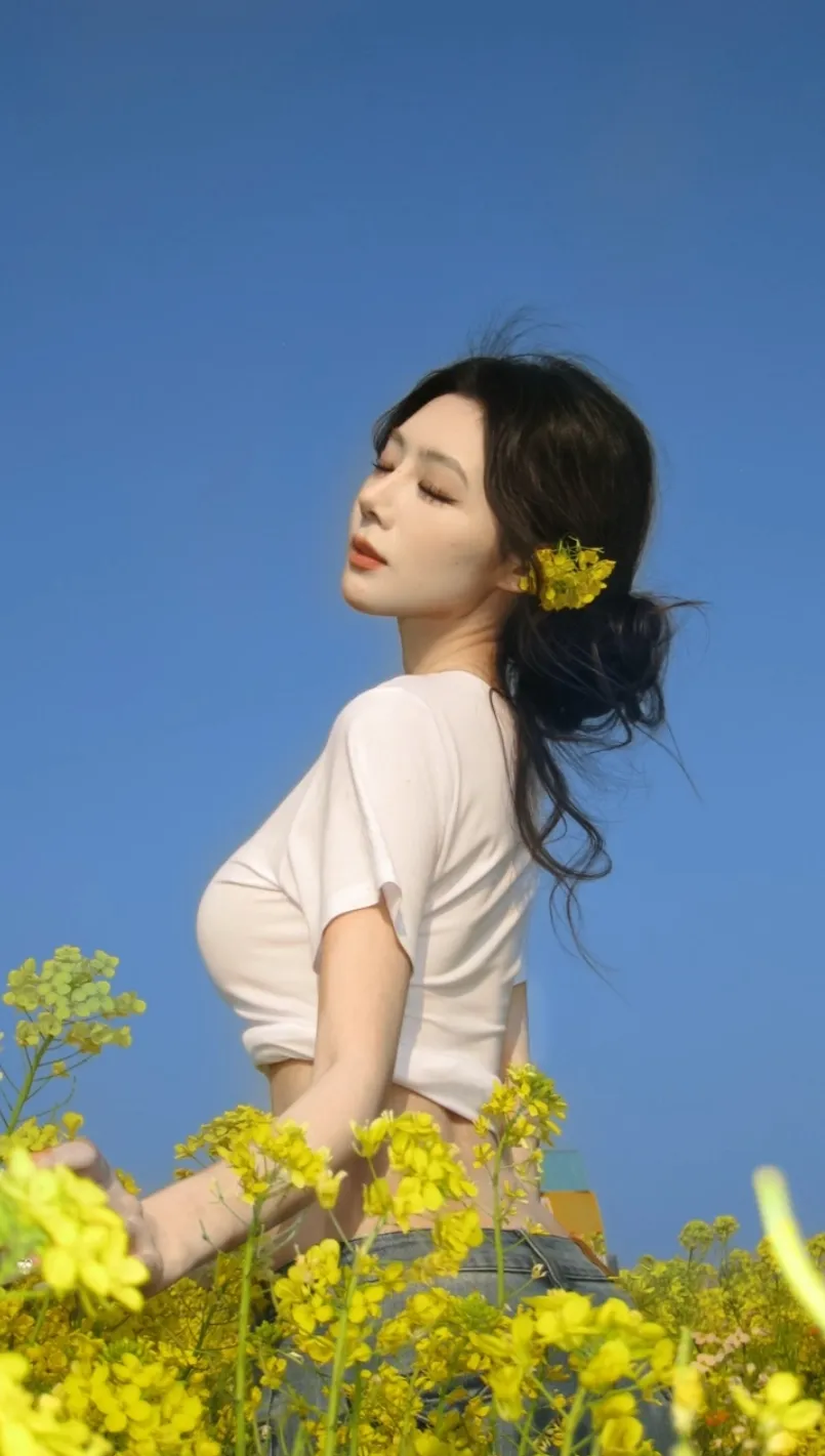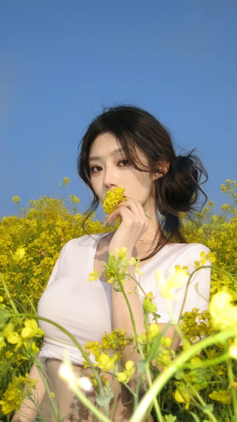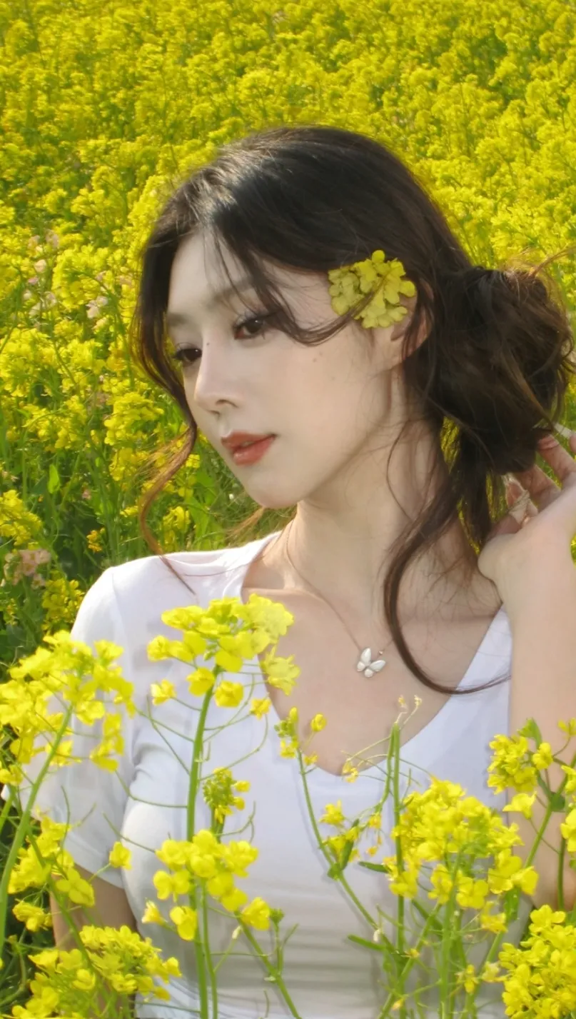 Al fotografiar, usa un dedo para sostener suavemente una flor de colza frente al cuerpo, cuerpo ligeramente de lado mirando a la camara, expresion relajada. La imagen parecera muy limpia, el color de las flores hara toda la foto mas brillante.