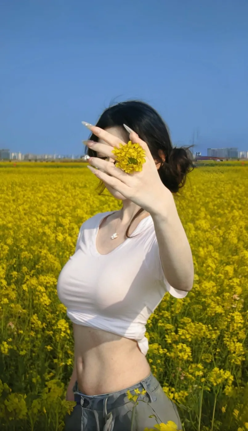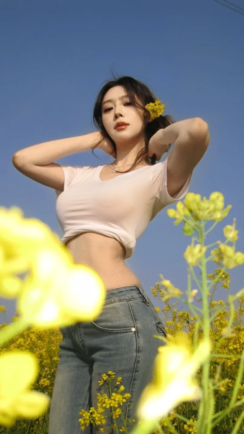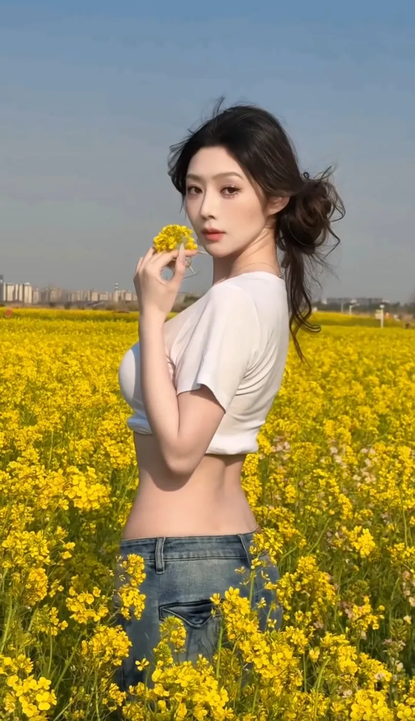 Al fotografiar, usa un dedo para sostener suavemente una flor de colza frente al cuerpo, cuerpo ligeramente de lado mirando a la camara, expresion relajada. La imagen parecera muy limpia, el color de las flores hara toda la foto mas brillante.