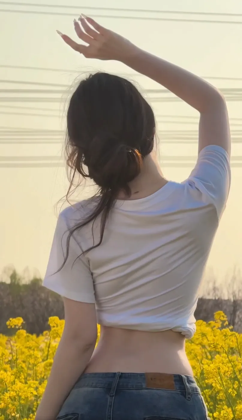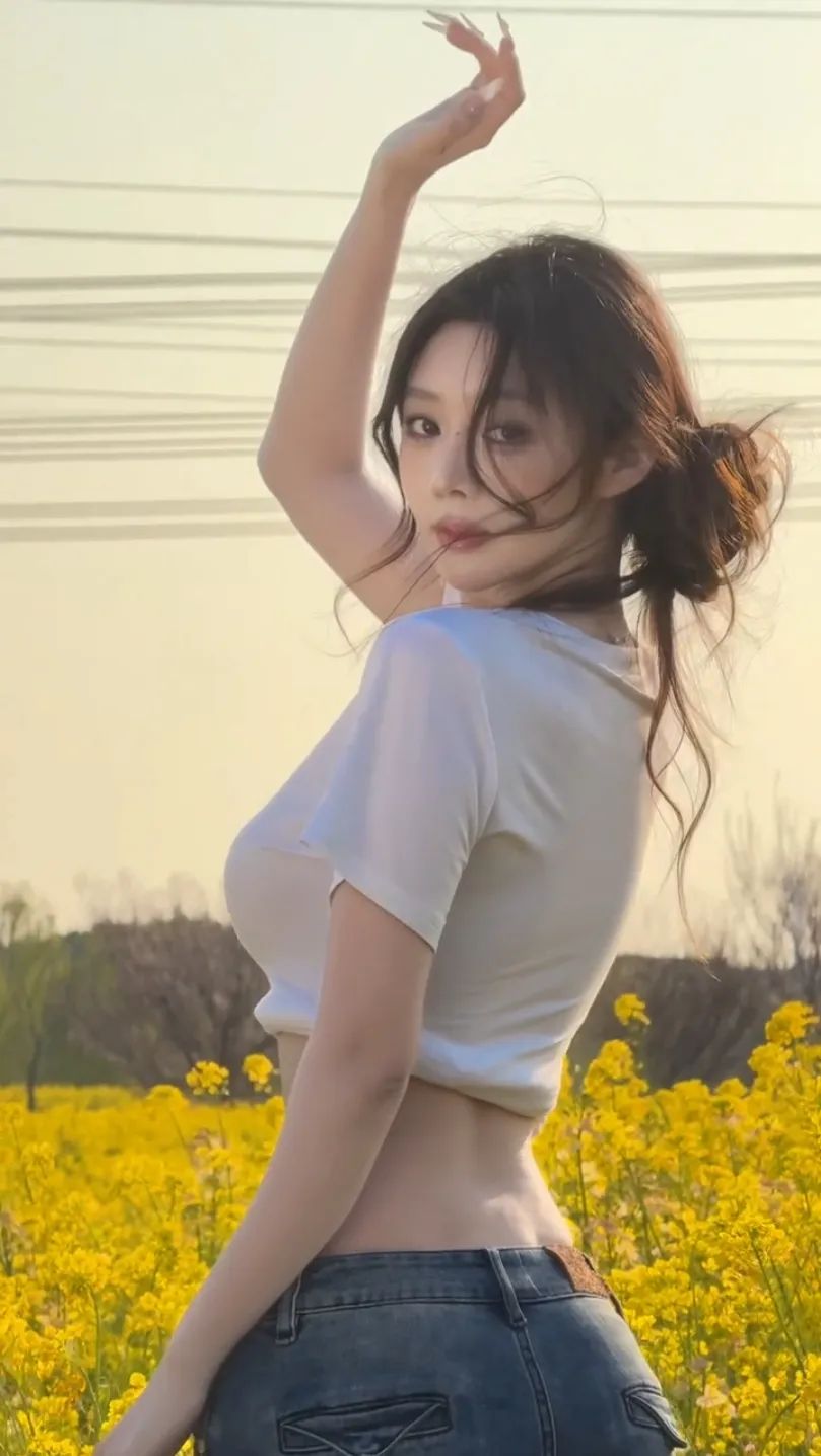 Al fotografiar, parate de lado y espalda en el mar de flores, una mano levantada para estirar el cuerpo, luego mira ligeramente hacia atras hacia la camara. Toda la persona parecera muy agil, las fotos de colza tambien tendran mejor presencia.