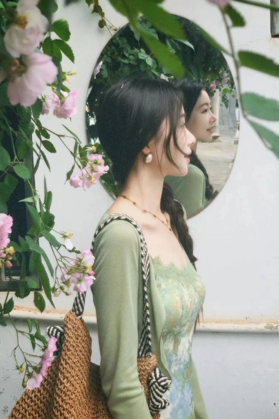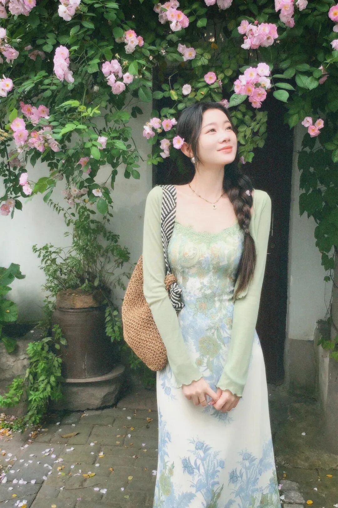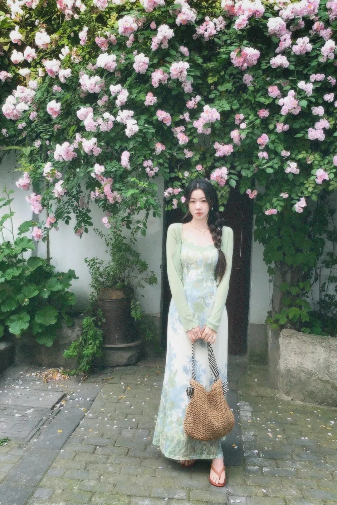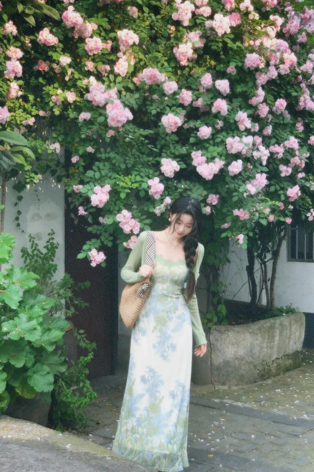 4: Pies cruzados bajo la pared de flores, ambas manos sosteniendo bolsa para foto de cuerpo completo. Bajo la pared de flores, cruza los pies, ambas manos naturalmente sosteniendo tu bolso, expresion puede ser sonrisa o mirada neutral hacia la camara. 提包是个很日常的动作,能消除手的尴尬。