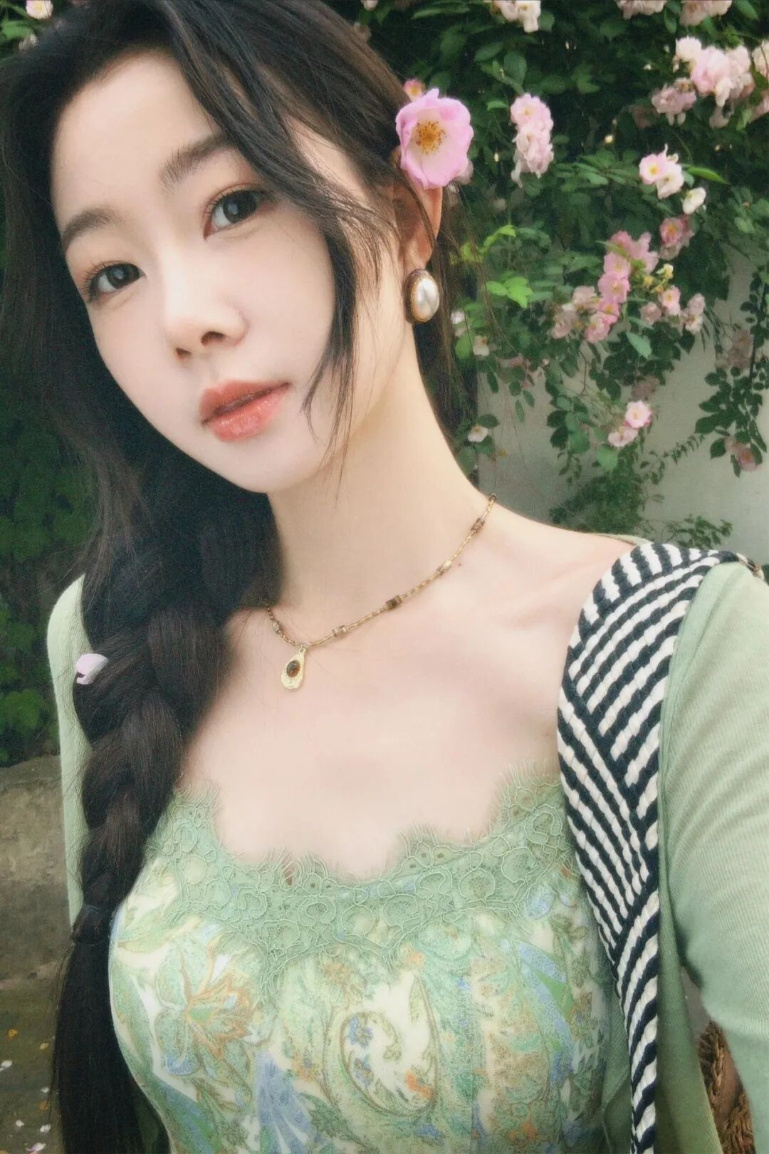 8: Pared de flores como fondo, cabeza inclinada sonriendote selfie contigo y las flores. Usa la pared de flores como fondo para selfie, sosten el telefono a la altura del pecho, cabeza ligeramente inclinada hacia un lado sonriendo a la camara. 自拍时表情更容易控制,歪头笑显得俏皮可爱。
